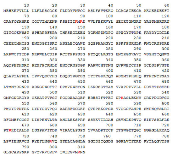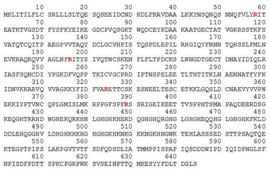 HPG sequence with arginine residues denoted in red text identified by LC-MS/MS as putatively modified by PPAD. The HPG sequence was obtained from UniProtKB database - P00747 (PLMN_HUMAN) record [41].