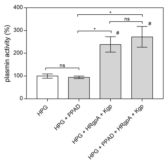 Conversion of HPG into active plasmin by HRgpA and Kgp in the presence of PPAD. A total of 300 nM HPG was incubated with 3 nM HRgpA and Kgp and 100 nM PPAD for 2 h at 37 °C. The gingipain inhibitors KYT-1 and KYT-36 were then added at a final concentration of 1 µM and the resulting plasmin activity in the presence of plasmin substrate was followed by monitoring the absorption of the released p-nitroaniline at 405 nm. Bars represent the mean values ± SEM. Untreated HPG served as a control. Statistical analysis was performed by one-way ANOVA with Tukey’s multiple comparisons test (p < 0.05) using GraphPad Prism. Statistical significance levels are indicated: * p< 0.05; ns, non-significant; # p < 0.05 vs. control.