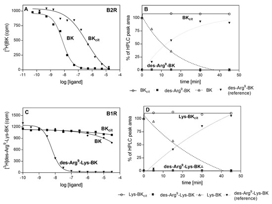 In vivo, the kinins are rapidly degraded by different kininases in the blood and other tissues [48]. The most important of these include carboxypeptidase M (CPM) that generates des-Arg9-BK, an agonist kinin for B1 receptors. To test whether citrullination can influence the degradation of kinins by this enzyme, BKcit and Lys-BKcit were subjected to CPM action and compared with the processing of non-modified kinins. The products of the enzymatic reaction were separated and identified using HPLC. This analysis revealed that the modification of kinin peptides prevents the formation of B1R agonists (Figure 10B,D). Additionally, a total loss of affinity to B1R was observed for BKcit in the competition test with tritium labeled des-Arg9-Lys-BK bound to B1R-overexpressing HEK293 cells.