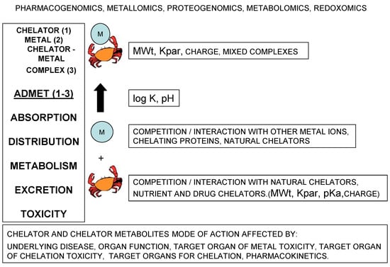 In each case the mode of action of chelators, chelating drugs and their metal complexes will be affected by competition with other natural chelators including chelating proteins and other metal ions. Similarly, in each case the absorption, distribution, metabolism, excretion and toxicity (ADMET) profile will be different and also be affected by pharmacogenomic, metallomic, proteogenomic, metabolomic and redoxomic factors (Figure 1).