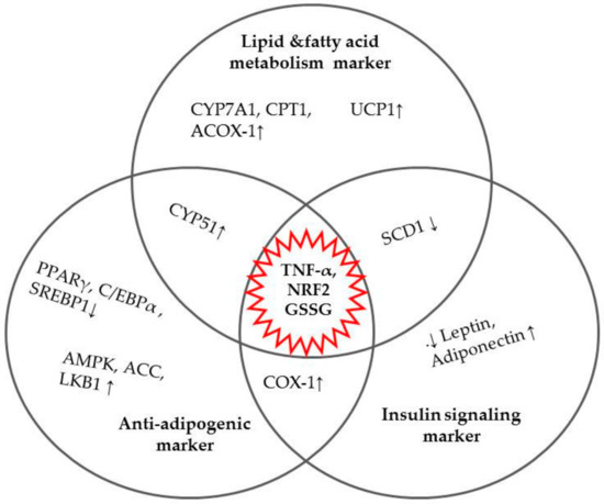 The molecular mechanism of obesity mediated by cytokines, adiponectin, and leptin has been correlated with increasing inflammation and oxidative stress, and leads to the development of metabolic diseases including certain types of cancer; hyperglycemia; type 2 diabetes; high blood pressure; and liver, heart, and gallbladder diseases [2,7]; which pose major health risks globally [8]. Specifically, obesity and type 2 diabetes are associated with an increase in oxidative stress and inflammation in adipose tissues [2,9,10]. Consequently, researchers have been exploring functional materials of plant origin that contain antioxidants to combat obesity and its comorbidities, as alternatives to conventional approaches that have been adopted previously—including surgery and anti-obesity drugs, which do not often have enduring effects and have side effects including headaches, excessive thirst, insomnia, constipation, and steatorrhea [11], or may have yo-yo effects [8,12]. Therefore, the consideration of antioxidants as therapeutic agents in the treatment and/or prevention of obesity and its comorbidities would be insightful.