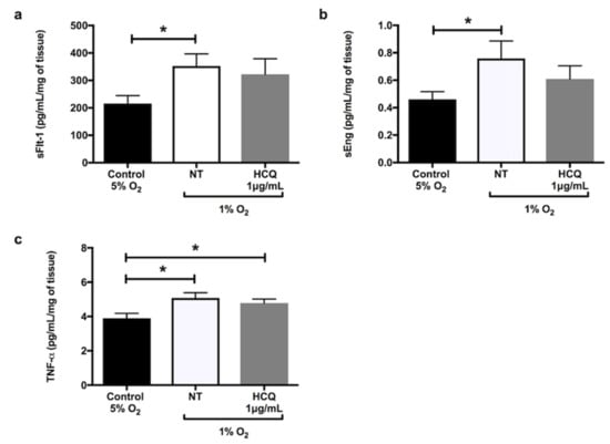 Release of (a) soluble fms-like tyrosine kinase-1 (sFlt-1), (b) soluble endoglin (sEng), and (c) tumour necrosis factor-α (TNF-α) by placental explants of human term normal pregnancy placentae after 24 h incubation at 5% oxygen concentration (normoxia) versus 1% oxygen (hypoxia). The explants were incubated in the hypoxic environment in the absence or presence of 1 μg/mL hydroxychloroquine. Data are mean ± standard error of the mean (SEM) from 10 independent biological replicates. * denotes p < 0.05. NT: non treated, HCQ: hydroxychloroquine.