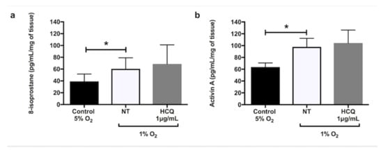 Hypoxia significantly increased the secretion of sFlt-1 (Figure 1a, p = 0.02), sEng (Figure 1b, p = 0.02), and TNF-α (Figure 1c, p = 0.02) from explant cultures after 24 h incubation. In the presence of X-XO (xanthine/xanthine oxidase system), explants cultured for 48 h significantly increased secretions of 8-isoprostane (Figure 2a, p = 0.03) and activin A (Figure 2b, p = 0.01) compared to controls. Co-incubation with 1 μg/mL hydroxychloroquine did not alter either the hypoxia-induced secretion of sFlt-1 (Figure 1a), sEng (Figure 1b), or TNF-α (Figure 1c), or the X-XO-induced increase in 8-isoprostane (Figure 2a) and activin A (Figure 2b).