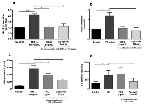 HUVECs were treated in the absence or presence of (i) TNF-α (100 ng/mL), (ii) sera from normal pregnancies (20%), or (iii) sera from preeclamptic women (20%) in the presence or absence of hydroxychloroquine (1 μg/mL) to assess endothelial dysfunction (Figure 3). Compared to controls, incubation of HUVECs with TNF-α (Figure 3a,c) or sera from preeclamptic women (Figure 3b,d) significantly increased both NADPH oxidase 2 (NOX2) mRNA expression (p < 0.001 and p = 0.01, respectively) and 8-isoprostane secretion (p = 0.02 and p = 0.04, respectively). Co-treatment of HUVECs with TNF-α and hydroxychloroquine significantly reduced NOX2 mRNA expression (Figure 3a, p = 0.03) and secretion of 8-isoprostane (Figure 3c, p = 0.04). Co-treatment of HUVECs with serum from preeclamptic women and hydroxychloroquine did not significantly alter the expression of NOX2 mRNA or 8-isoprostane. However, 100 μM apocynin, a NOX inhibitor, significantly reduced the NOX2 mRNA expression and 8-isoprostane release induced by serum from preeclamptic women (Figure 3b,d, respectively, p < 0.01 for both).