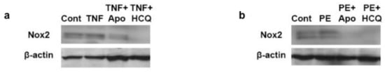 Western blot representative for NOX2 protein expression of HUVECs untreated (cont) or treated with 100 ng/mL TNF-α (a) or 20% preeclampsia (PE) sera (b) with or without apocynin (apo, 100 μM) or hydroxychloroquine (HCQ, 1 μg/mL). β-actin was used as a loading control.