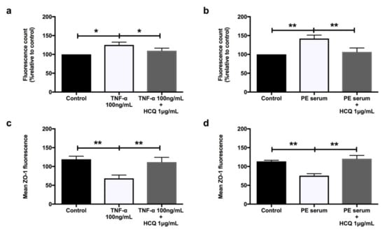 HUVECs’ permeability when treated with 100 ng/mL recombinant TNF-α (a) and 20% preeclampsia sera (b) (n = 9). Mean zonula occludens 1 (ZO-1) fluorescence when treated with 100 ng/mL recombinant TNF-α (c) and 20% preeclampsia sera (d) (n = 6). Data are means ± SEM from nine and six independent biological replicates, respectively. * denotes p < 0.05, and ** denotes p < 0.005.