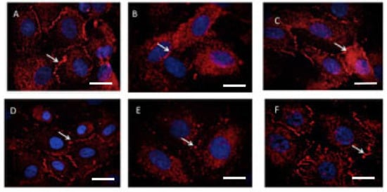 Figure 6 contains representative images of ZO-1 immunostaining. There was normal ZO-1 immunostaining in untreated or HUVECs treated with sera from normal pregnancies (Figure 6A,D), with the loss of immunostaining in cells treated with either TNF-α (Figure 6B) or preeclampsia sera (Figure 6E). Hydroxychloroquine rescued the loss of ZO-1 induced by both TNF-α (Figure 6C) and preeclampsia sera (Figure 6F).