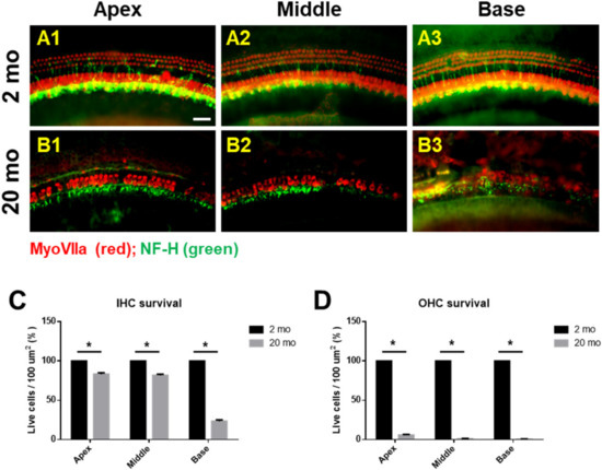 - Han, F.; Wang, O.; Cai, Q. Anti-apoptotic treatment in mouse models of age-related hearing loss. J. Otol. 2016, 11, 7–12. [Google Scholar] [CrossRef]