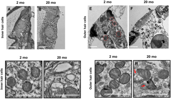 - Someya, S.; Prolla, T.A. Mitochondrial oxidative damage and apoptosis in age-related hearing loss. Mech. Ageing Dev. 2010, 131, 480–486. [Google Scholar] [CrossRef] [PubMed]