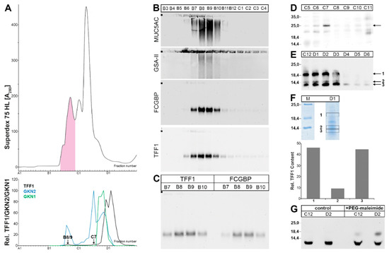 Analysis of human gastric corpus extract (MC-383; homogenized in a mortar). (A) Elution profile after size exclusion chromatography (SEC) on a Superdex 75 HL column, as determined by absorbance at 280 nm (periodic acid-Schiff (PAS)-positive mucin fractions: pink). Underneath: Distribution of the relative TFF1 (black), GKN2 (blue), and GKN1 (green) content as determined by Western blot analysis under reducing conditions and semi-quantitative analysis of the typical monomeric band intensities. (B) 1% agarose gel electrophoresis (AgGE) and subsequent Western blot analysis of the fractions B3-C4 concerning MUC5AC, MUC6 (lectin GSA-II), FCGBP, and TFF1. The start is marked with a dot on the left. (C) 1% AgGE and subsequent Western blot analysis of the fractions B7-B10 concerning TFF1 and FCGBP, respectively. (D) 15% sodium dodecyl sulfate-polyacrylamide gel electrophoresis (SDS-PAGE) (non-reducing conditions) and subsequent Western blot analysis of fractions C5-C11 concerning TFF1 (post-reduction step on the membrane). The molecular mass standard is indicated on the left. (E) 15% SDS-PAGE (non-reducing conditions) and subsequent Western blot analysis of fractions C12-D6 concerning TFF1 (post-in-gel-reduction). (F) 15% SDS-PAGE (non-reducing conditions) and Coomassie staining of fraction D1 (M: marker). Then, proteins were eluted from the bands 1, 2, and 3, subjected to reducing 15% SDS-PAGE, and the TFF1 content was measured by semi-quantitative Western blot analysis. (G) 15% SDS-PAGE (reducing conditions) and Western blot analysis concerning TFF1 of fractions C12 and D2 with or without polyethylene glycol (PEG)-maleimide treatment.