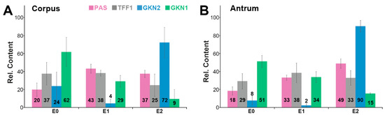 The gastric mucus is composed of two layers, a loosely adherent outer layer contacting the gastric juice and a firmly attached water-insoluble inner layer [42]. As TFF1 is part of both the gastric mucus and the gastric juice, it was tested as to whether TFF1 could be extracted simply by washing the gastric specimens (corpus and antrum, respectively) in a rotating wheel (for details, see Section 4.2.). The supernatant E0 represents an easily diffusible fraction of extracellular proteins. The remaining cell pellet was extracted with buffer yielding supernatant E1, which represents a fraction of soluble proteins. Finally, the remaining cell pellet was extracted twice with 1% SDS (at 50 and 100 °C, respectively) and the combined supernatants E2 were obtained representing a fraction of hardly soluble proteins. In all samples (E0, E1, E2 of the gastric corpus and antrum, respectively), the relative TFF1, GKN2, and GKN1 contents were determined (by semi-quantitative Western blot analysis) as well as the mucin content (by PAS staining).