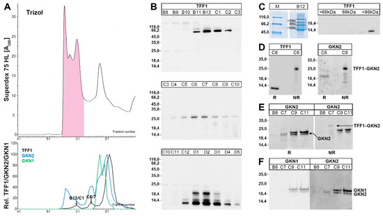 Analysis of a human gastric corpus extract (MC-577) after TRIzol® extraction. (A) Elution profile after SEC on a Superdex 75 HL column, as determined by absorbance at 280 nm (PAS-positive mucin fractions: pink). Underneath: Distribution of the relative TFF1 (black), GKN2 (blue), and GKN1 (green) immunoreactivities respectively, as determined by Western blot analysis under reducing conditions and semi-quantitative analysis of the typical monomeric band intensities. (B) 15% SDS-PAGE (non-reducing conditions) and subsequent Western blot analysis of fractions B8-D5 concerning TFF1 (post-in-gel reduction). The molecular mass standard is indicated on the left. (C) 15% SDS-PAGE (non-reducing conditions) and Coomassie staining of fraction B12. Then, the bands >66k, 66k, and <66k were cut out as indicated, proteins were eluted, subject to reducing 15% SDS-PAGE, and the TFF1 content was tested by Western blot analysis. (D) 15% SDS-PAGE and subsequent Western blot analysis of fraction C6. Samples were analyzed under reducing (R) or non-reducing (NR) conditions for their TFF1 and GKN2 immunoreactivities, respectively. (E) 15% SDS-PAGE and subsequent Western blot analysis of the fractions B8, C7, C9, and C11. Samples were analyzed under reducing (R) or non-reducing (NR) conditions respectively, for their GKN2 immunoreactivity. (F) 15% SDS-PAGE (reducing conditions) and subsequent Western blot analysis of the fractions B8-C11 concerning GKN1 and GKN2, respectively.