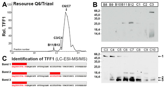 Bands 1–3 were subjected to tryptic digestion followed by liquid chromatography-electrospray ionization-tandem mass spectrometry (LC-ESI-MS/MS) analysis for protein identification (Figure 4C). Human TFF1 was identified in all three bands.