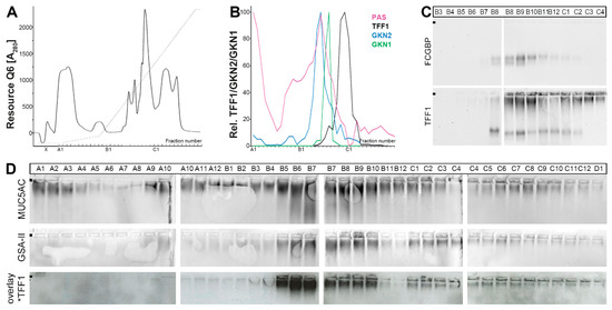 TFF1 has been reported to bind as a lectin to a lipopolysaccharide of H. pylori [29]. In an attempt to test whether TFF1 might also be able to bind to gastric glycoproteins, e.g., mucins, a gastric extract was separated by anion-exchange chromatography (Figure 5A) and analyzed for the content of the mucins MUC5AC and MUC6 (using the lectin GSA-II; Figure 5D). As a control, the distributions of TFF1, GKN2, GKN1, and FCGBP were also analyzed (Figure 5B,C).