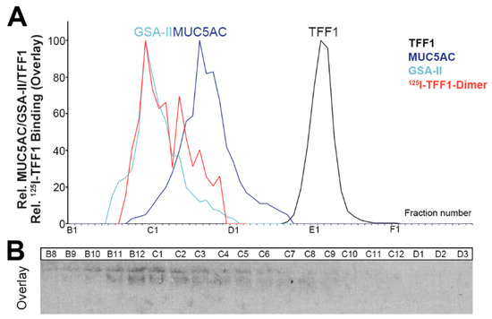 As we could previously separate MUC5AC and MUC6 by SEC on an S-500 column [43], here, we used just the same fractions for hybridization studies with 125I-TFF1 homodimer (Figure 6). The hybridization pattern confirmed that TFF1 bound to the mucin MUC6, but not MUC5AC (Figure 6A). This was surprising because TFF1 is synthesized in surface mucous cells, whereas MUC6 is a secretory product of mucous neck and antral gland cells. Thus, TFF1 seems to interact with the same mucin as TFF2 [43]. These results are in line with a study indicating that binding of TFF1 correlates with binding of H. pylori to gastric mucins recognized by the lectin GSA-II [78], i.e., MUC6 [43]. However, binding of TFF1 to MUC6 is in contrast to previous reports describing interactions with MUC5AC [79,80].