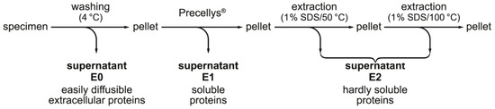 Furthermore, an extended stepwise extraction protocol was applied as described [43]. For details, see Figure 7. In brief, gastric specimens were washed with a 5-fold amount (w/v) of buffer (30 mM NaCl, 20 mM Tris-HCl pH 7.0 plus protease inhibitors) in a rotating wheel for one hour and after centrifugation, the supernatant E0 was obtained. Then, the remaining cell pellet was extracted in a Precellys®24 lyser/homogenizer yielding supernatant E1. Additionally, the remaining cell pellet was dissolved in a 2.5-fold amount of 1% SDS (incubation for 30 min at 50 °C). After centrifugation, the pellet was dissolved again with 2.5-fold amount of 1% SDS (boiling for 5 min). After centrifugation, both clear supernatants after SDS extraction were extracted with CHCl3 and combined yielding E2.