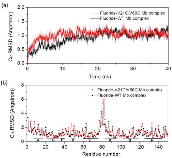 It has been shown that the heme axial water molecule in Mb (Figure 1a) can be removed upon binding of small exogenous ligands such as a fluoride ion, in turn, the fluoride ion can be used as a probe to study the hydrogen (H)-bond interactions in the heme distal site [34,35,36,37,38,39]. To provide dynamics information for V21C/V66C Mb in complex with the fluoride ion, as well as for the fluoride–Wild-type (WT) Mb complex, we performed MD simulations for both protein complexes and monitored the Cα root mean square deviation (RMSD) from the starting structure during 40 ns of MD simulations. As shown in Figure 2a, the RMSD profile of fluoride–V21C/V66C Mb (red) and fluoride–WT Mb (black) complexes fluctuates around 1 Å after ~10 ns and ~20 ns, respectively. This observation indicates that the fluoride–V21C/V66C Mb complex first achieves a stable equilibration of the overall structure compared with that of the fluoride–Mb complex, likely due to the stabilization effect of Cys21-Cys66 disulfide bond.