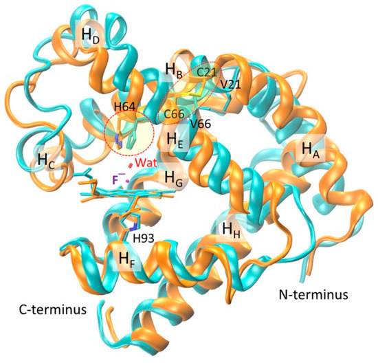With energy minimization and equilibration, the simulated overall structure of the two fluoride–Mb complexes is similar. To make a detailed structural comparison, we overlapped the two structures according to the heme iron center. As shown in Figure 3, the spatial orientations of α-helices HA–HE are slightly different between these two complexes, whereas those of the last three α-helices HF–HH are very similar to each other. With the formation of Cys21-Cys66 disulfide bond, the loop between HA and HB where Cys21 is located shifted toward the middle of HE where Cys66 is located, which induced a locally structural rearrangement. As a result, both HC and HD, including the long loop connecting, underwent a structural rearrangement. Note that the introduction of a de novo disulfide of Cys46–Cys55 in this region mimicking that in native human Ngb regulates the protein structure and enhances the peroxidase activity [32]. These results also agree with the structural comparison between WT Mb and F46S/V21C/V66C Mb triple mutant in their X-ray crystal structures [33], albeit with more protein motions in MD simulations due to in the solution state.