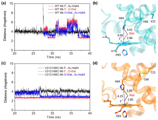 In case of the fluoride–V21C/V66C Mb complex (Figure 4c,d), it was found that the heme distal His64 has a slightly large distance to the axial fluoride ion (~4.3 Å). Similarly, a distal water molecule interacted with both the distal His64 and the fluoride ion, by forming an H-bonding network. Although several water molecules were also observed in the MD trajectory, the H-bond distances of the distal water did not change dramatically, especially for the last 12 ns. Note that multiple water molecules were also observed in the X-ray structure of Mb with a modified heme center, such as in L29E Mb mutant containing three water molecules, which was found to regulate ligand binding including the fluoride ion, as well as protein reactivity such as H2O2 activation [41]. These observations suggest that with the formation of the Cys21–Cys66 disulfide bond and structural rearrangement, the fluoride ion may exhibit a different binding property to the heme iron compared to that binding to WT Mb.