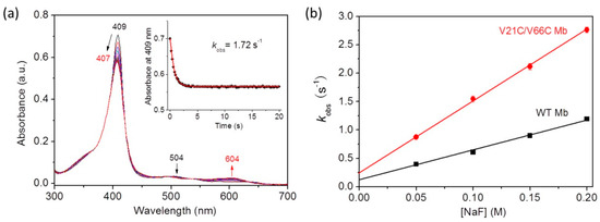 With the theoretical information from MD simulation, we were also interested in determining the kinetic parameters for fluoride binding to the protein using the experimental method. For this purpose, we performed stopped-flow UV–Vis spectroscopic studies for fluoride binding to V21C/V66C Mb, with WT Mb as a control. As shown in Figure 5a, the spectra showed that the Soret band rapidly shifted from 409 nm to 407 nm upon mixing V21C/V66C Mb with the fluoride ion, with a decrease of 504 nm in absorption and concomitant increase of a charge-transfer (CT1) band at 604 nm, similar to that observed for fluoride binding to a dehaloperoxidase (DHP) (605 nm) [42]. The resultant new spectrum (407 nm and 604 nm) resembles that of the fluoride–WT Mb complex (406 nm and 607 nm), as reported in a previous study [38]. Moreover, as shown in Figure 5a (inset), the absorbance change of the Soret band was fitted well to a single exponential decay equation, indicating the rapid formation of a stable fluoride–protein complex within 5 s.