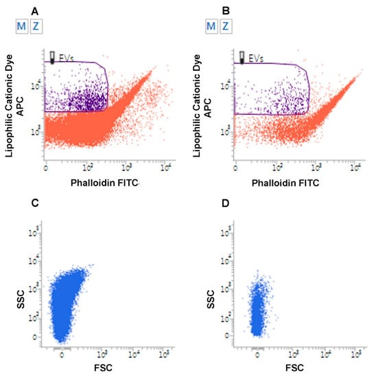 Several techniques can be used for EV identification and characterization [,,]. Specific EV proteins are commonly detectable by immunoblotting for EV-associated proteins (e.g., ALIX, TSG101 and specific tetraspanins, such as CD63, CD9, and CD81), frequently used to confirm the presence of EVs in fluids [,]. The most direct method to determine EV size and morphology is electron microscopy (EM), including both transmission EM (TEM) [,] and scanning EM (SEM) [,,]. To avoid sample dehydration, cryogenic EM techniques have been developed, of which cryogenic TEM (cryo-TEM) is the most appropriate [] (Figure 1). Atomic Force Microscopy (AFM), which is also used [,], provides information about specific properties, such as EV stiffness and elasticity []. While EM and AFM resolve the size of individual EVs, dynamic light scattering (DLS) is used to determine the collective mobility (diffusion coefficient) of the scattering vesicles. The resulting size distribution is characterized by average size and polydispersity []. Other techniques include nanoparticle tracking Analysis (NTA), tunable resistive pulse sensing (TRPS), and asymmetric-flow field-flow fractionation (AF4). NTA is based on recording a time-lapse of particles undergoing Brownian motion measuring scattered light (Sc-NTA) or emitted fluorescence (Fl-NTA) []. By the analysis of many individual EV trajectories, NTA can assess particle concentration and size distribution, even in polydisperse samples. TRPS detects individual EVs by measuring changes in electrical current as each vesicle passes through an adjustable nanopore [,]. AF4 separates EVs on the basis of hydrodynamic size and can identify and sort out vesicles ranging from few nanometers to an undefined level of micrometers []. Last but not least, flow cytometry (FC), commonly used for the analysis of cells, is being actively developed for EV analysis [,] and is adopted by an increasing number of research groups, mainly to study the larger EVs [,]. Direct FC analysis using tracers that stain the whole vital EV compartment, such as lipophilic carbocyanine dyes, combined with phalloidin, that selectively binds to F-actin, accurately discriminates EVs from artifacts [,,,]. Standardized FC has a high potential for the detection of EVs in body fluids and, when combined with specific antibodies, concurrently allows EV immunophenotypic characterization [,,,,,] (Figure 2). Imaging flow cytometers combining conventional FC with fluorescence provide new, highly sensitive tools for EV studies [,].