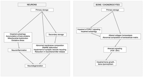 Examples of MPSs clinical manifestation triggered by primary storage and linked to secondary cellular impairments and altered signaling. In neurons and brain (left) impaired autophagy, mitochondrial dysfunction, oxidative stress, and secondary storage cause neuroinflammation, abnormal membranes composition, soluble N-ethylmaleimide-sensitive factor attachment protein receptors (SNARE) disfunction, impairment of synaptic vesicle recycling, and reduction in neurotransmitter release ultimately leading to neurodegeneration. In bone (right) secondary events, like aberrant mammalian target of rapamycin complex 1 (mTORC1) signaling, impaired autophagy, altered collagen homeostasis, abnormal composition of extracellular matrix e aberrant signaling, result in impaired bone growth and bone dysmorphism.