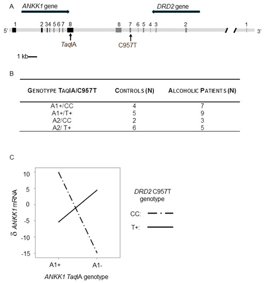 ANKK1 and DRD2 genes interaction effect on ANKK1 expression levels of human PBMCs after apomorphine (APO) treatment. (A) ANKK1/DRD2 locus showing the location of ANKK1 TaqIA and DRD2 C957T SNVs. Black and grey boxes are ANKK1 and DRD2 exons, respectively. (B) ANKK1 TaqIA genotypes: A1+ (A1 allele homozygous and heterozygous) and A1- (homozygous for the A2 allele) and, DRD2 C957T genotypes: CC (C allele homozygous) and T+ (homozygous for the T allele and heterozygous) in a clinical series of alcoholic patients and control individuals. (C) δ ANKK1 mRNA: ANKK1 mRNA level differences after APO treatment.