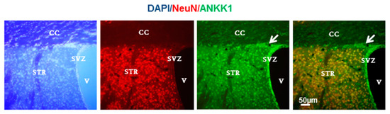ANKK1 is expressed in post-mitotic neurons and also in adult neural stem cells and migrating neuroblasts of the adult mouse brain [18]. Immunostaining of ANKK1 and NeuN (marker of mature neurons) has been performed as previously described [18]. The white arrow indicates migrating neural precursors. CC: corpus callosum, STR: Striatum, SVZ: Subventricular zone, V: ventricle. Images were taken from confocal optical sections that are representative for the group averages. Scale bars: 50 μm.