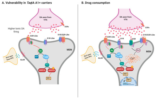 Proposed model for the relationship of ANKK1, the dopaminergic system in the mesolimbic brain and addiction. (A). The vulnerability of ANKK1 A1+ genotype carriers and tonic dopamine firing, (B). Drug consumption, phasic DA firing and ANKK1 expression. DA: dopamine (rose dots); VTA: ventral tegmental area; D2R: DA receptor D2; MSN medium spiny neurons; AC: adenyl cyclase; D1R: DA receptor 1; PLC: Phospholipase C beta; D5R: DA receptor 5; D1R-like/D2R –like: DA hetero-oligomers; cAMP: cyclic AMP; Ca2+: calcium (yellow dots); DARPP-32: DA- and cAMP-regulated phosphoprotein, Mr 32,000; PP1: protein phosphatase 1 GLUR: glutamatergic receptor. Created with BioRender.