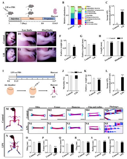 Assessing the development of mouse embryos from dysbacteriosis pregnant mice and the chick embryos treated with lipopolysaccharide (LPS). (A) Sketch illustrating the mouse model of lincomycin hydrochloride (LH)-induced dysbiosis of intestinal microbiota. (B,C) Bar charts showing the relative abundance of main bacteria in mouse guts at the class level of control and LH-treated groups (B) and the LPS level in mice serum (C). (D–E2) Representative bright-field images of E14.5 mouse embryos of control (D) and LH-treated (E) groups. High magnification images for forelimb (D1–E1) and hindlimb (D2–E2). (F–H) Bar charts showing embryo weights (F), lengths (G), as well as the lengths of forelimbs and hindlimbs (H) of control and LH-treated groups. (I) Sketch illustrating the model of LPS-treated chick embryos. (J–L) Bar charts showing embryo mortality (J), weights (K), as well as the serum LPS levels (L) of control and LPS-treated E17 chick embryos. (M,N,M1–N5) Representative Alcian blue/alizarin red whole-stained images of E17 chick embryos of control (M) and LPS-treated (N) groups. High magnification images of tibia (M1,N1), femur (M2,N2), humerus (M3,N3), ulna/radius (M4,N4), and phalanges (M5,N5). (O–T) Bar charts comparing the length of tibia, femur, humerus, ulna, radius, and phalanges between control and LPS-treated groups. Scale bars = 3 mm in (D–E,D1–E1,D2–E2,M3–M5,N3–N5); 10 mm in (M–N,M1–M2,N1–N2). (* p < 0.05, ** p < 0.01, *** p < 0.001).