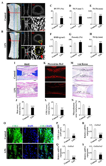 The assessment of osteogenesis in chick embryonic phalanges following LPS treatment. (A,B) The representative micro-CT images of the first phalanges of E17 chick embryos of control (A) and LPS-treated (B) groups. (A1–A3,B1–B3) are the longitudinal or transverse sections as indicated in (A,B), while (A4,B4) are high magnification images of the area indicated in (A2,B2). Yellow dotted circles in (B3,B4) show the rupture of and missing trabecular bone in the LPS-treated group. (C–H) Bar charts comparing the micro-CT parameters of bone volume fraction (BV/TV), trabecular numbers (Tb.N), trabecular thickness (Tb.Th), bone mineral density (BMD), porosity, and trabecular separation (Tb.Sp) between control and LPS-treated groups. (I–M) Representative images of H&E (I), Picrosirius red (K), and von Kossa (M) staining of control and LPS-treated groups. (J–N) Bar charts showing the ratios of area of bone (J), COL1 (L), and mineralization (N) of the total area between control and LPS-treated groups. (O) Representative immunofluorescent staining of COL1 and DAPI. Negative controls were shown in Supplementary Materials (Figure S6). (P) Bar chart showing the area of COL1 per high-powered field (HPF) of control and LPS-treated groups. (Q,S) qPCR data showing the mRNA expression of Col1α1 (Q), Col1α2 (R), and the ratio of Col1α1/Col1α2 (S) of control and LPS-treated groups. Scale bars = 0.5 mm in (A–A3,B–B3); 0.25 mm in (A4,B4, I–M); 20 μm in (O). OZ: ossification zone. (* p < 0.05, ** p < 0.01, *** p < 0.001).