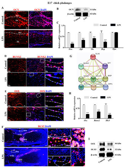 To explore the mechanism of aberrant skeleton development induced by dysbacteriosis-elevated LPS, we evaluated the expression of osteogenesis-related genes in E17 chick embryos exposed to LPS (Figure 3). Combined immunofluorescent staining and Western blot data showed that osteocalcin (OCN/BGLAP) expression was significantly depressed in presence of LPS (Figure 3A,B). qPCR confirmed that the expression of Ocn and also alkaline phosphatase (Alpl/Tnap), osteonectin (On/Sparc), and bone sialoprotein (Ibsp) were all downregulated in the LPS-treated group. Osteopontin (Opn/Spp1) was not depressed (Figure 3C). Immunofluorescent staining of RUNX2 and OSX demonstrated that their expressions in the E17 chick phalanges were dramatically suppressed by LPS treatment (Figure 3D,E). Analysis with the STRING (Protein–Protein Interaction Networks, Functional Enrichment Analysis) database demonstrates that DLX5 plays a vital role among the protein–protein interactions during osteoblastogenesis through its control of the expression of downstream genes such as OCN, ON, IBSP, RUNX2, and OSX (Figure 3G). Subsequent qPCR, immunofluorescent staining, and Western blot data confirmed that DLX5, RUN2, and OSX were downregulated in presence of LPS (Figure 3D–F,H,I).