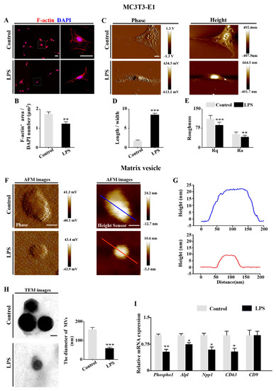To investigate the possible underlying reasons for suppressed osteogenic differentiation, we studied the morphology of osteoblasts following exposure to LPS in vitro (Figure 4). F-actin staining showed the morphological change of MC3T3-E1 cells following LPS exposure after 7 days (Figure 4A,B). Atomic force microscopy (AFM) data demonstrated that LPS treatment increased the ratio of cell length to width, while Rq (root-mean-square roughness) and Ra (average roughness) of the MC3T3-E1 cells were significantly decreased in presence of LPS compared to controls (Figure 4C–E). Under AFM, the heights of the released MVs were considerably reduced in the presence of LPS (Figure 4F,G). This was further confirmed by transmission electron microscopy (TEM) analysis on the diameter of the MVs, as well as the mRNA expression of MV-associated markers phosphoethanolamine/phosphocholine phosphatase 1 (Phospho1), tissue nonspecific alkaline phosphatase (Tnap), ectonucleotide pyrophosphatase/phosphodiesterase 1 (Npp1), CD63, and CD9 (Figure 4H,I).