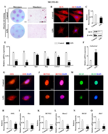 Assessment of the differentiation of MC3T3-E1 cells following LPS treatment. (A) Representative images of alizarin red staining of MC3T3-E1 cell mass cultures (left panels) or monolayer cultures after cultured for 21 days (right panels) of the control and LPS groups. (B,C) Representative images of OCN immunofluorescent staining on MC3T3-E1 cells counterstained with DAPI in control and LPS-treated groups Negative controls were shown in Supplementary Materials (Figure S7). (B). OCN expression was quantified with fluorescence intensity (C). (D) Western blot data showing OCN expression of control and LPS-treated MC3T3-E1 cells. (E,F) qPCR data showing the expressions of Ocn, On, Alpl, Ibsp, Col1α1, Col1α2, and Col1α1/Col1α2 in control and LPS-treated MC3T3-E1 cells. (G,J,M) Representative images of DLX5 (G), RUNX2 (J), and OSX (M) immunofluorescent staining on MC3T3-E1 cells, counterstained with DAPI. Negative controls were shown in Supplementary Materials (Figure S7). (H,K,N) Fluorescent staining intensities of DLX5 (H), RUNX2 (K), and OSX (N) of control and LPS-treated MC3T3-E1 cells. (I,L,O) qPCR data showing the mRNA expression of Dlx5, Runx2, and Osx in control and LPS-treated MC3T3-E1 cells. Scale bars = 5 mm in (A); 20 μm in (B,G–M). (* p < 0.05, ** p < 0.01, *** p < 0.001).