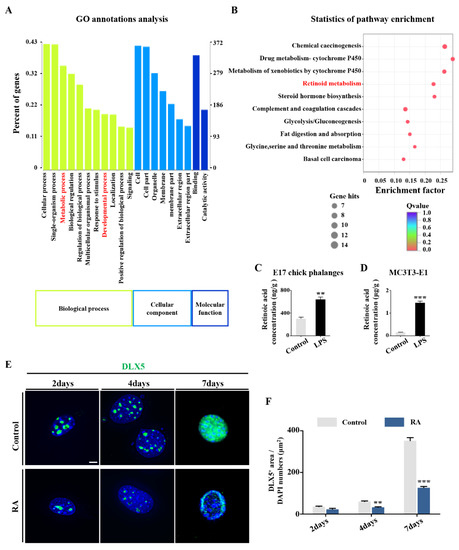To fully elucidate the mechanism of abnormal osteogenic gene expressions, we next focused on DLX5, the activator of the transcription factors regulating osteogenesis. DLX5 exerts function from the very early stages of bone development. We implemented RNA sequencing to screen for gene expression changes in E1.5 chick embryos exposed to LPS. GO annotations analysis was used to establish the affected signal pathway caused by LPS exposure, including those related to the biological processes, cellular components, and molecular functions (Figure 6A). The genes involved with development and metabolism proved to be closely related to dysbacteriosis. This was further enriched by KEGG analysis which revealed that retinoid metabolism underwent a significant change following LPS treatment (Figure 6B). This was subsequently verified by the results determining the RA level in both E17 chick phalanges and MC3T3-E1 cells exposed to LPS (Figure 6C,D). Subsequently, DLX5 expression was checked in MC3T3-E1 cells exposed to RA, showing a similar tendency as was seen with LPS treatment (Figure 6E,F).