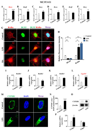 Determining the expressions of RA signaling and DLX5 following LPS treatment. (A–F) qPCR data showing the mRNA expression of RARα (A), RARβ (B), RARγ (C), RXRα (D), RXRβ (E), and RXRγ (F) in MC3T3-E1 cells of control and LPS-treated groups. (G) Representative images of RARα and DLX5 immunofluorescent staining in control, LPS-treated, and RA-treated MC3T3-E1 cells, counterstained with DAPI. Negative controls were shown in Supplementary Materials (Figure S7). (H) Immunofluorescent intensity of RARα and DLX5 expressions was quantitatively measured in control, LPS-treated, and RA-treated MC3T3-E1 cells. (I–L) qPCR data showing the expression of Raldh1 (I), Raldh2 (J), Raldh3 (K), and Cyp1b1 (L) in MC3T3-E1 cells from control and LPS-treated groups. (M) Representative images of CYP1B1 immunofluorescent staining in control and LPS-treated MC3T3-E1 cells, counterstained with DAPI. Negative controls were shown in Supplementary Materials (Figure S7). (N) Expression of CYP1B1 in each group was quantified with CYP1B1-positive area/total DAPI-positive cell numbers (N) in control and LPS-treated groups. (O) Western blot data showing the expression of CYP1B1 in MC3T3-E1 cells of control and LPS-treated groups. (P) qPCR data showing the mRNA expressions of Crabp2 and Fabp5 in control and LPS-treated MC3T3-E1 cells. Scale bars = 10 μm in (G); 6 μm in (M). (* p < 0.05, ** p < 0.01, *** p < 0.001).