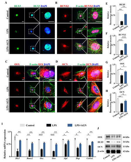 Determining the expression of osteogenesis-related genes following LPS treatment and blockage of RA signaling. (A–D) Representative images of DLX5 immunofluorescent staining on MC3T3-E1 cells, counterstained with DAPI (A), immunofluorescent staining of RUNX2 (B), Osx (C), and OCN (D), counterstained with F-actin and DAPI from control, LPS-treated, and LPS+AGN-treated groups. Negative controls were shown in Supplementary Materials (Figure S7). (E–H) Fluorescent staining intensities of DLX5 (E), RUNX2 (F), OSX (G), and OCN (H) from control, LPS-treated, and LPS+AGN-treated groups. (I) qPCR data showing the mRNA expression of Dlx5, Osx, Runx2, Ocn, Alpl, Ibsp, and Col1α1 in MC3T3-E1 cells from control, LPS-treated, and LPS+AGN-treated groups. (J) Western blot data showing the protein expressions of OSX, DLX5, and OCN in MC3T3-E1 cells from control, LPS-treated, and LPS+AGN-treated groups. Scale bars = 15 μm in (A–D). (* p < 0.05, ** p < 0.01, *** p < 0.001).