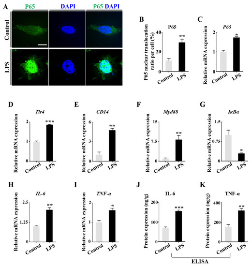 Determining the expression of the inflammatory factors following LPS treatment. (A) Representative images of P65 immunofluorescent staining on control and LPS-treated MC3T3-E1 cells, counterstained with DAPI. Negative controls were shown in Supplementary Materials (Figure S7). (B) Bar chart comparing the P65 nuclear translocation ratios (percentage) in every cell between control and LPS-treated group. (C–I) qPCR showing the expressions of P65, Tlr4, CD14, Myd88, IL-6, and TNF-α genes at mRNA level of control and LPS-treated MC3T3-E1 cells. (J,K) ELISA assay showing the protein expression of IL-6 and TNF-α. Units represent measured protein normalized to total protein. Scale bars = 10 μm in (A). (* p < 0.05, ** p < 0.01, *** p < 0.001).