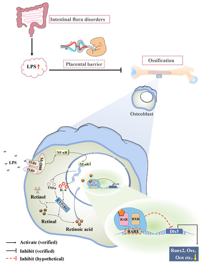In summary, we proposed that gut microbiota dysbiosis led to the elevated level of LPS in maternal serum. The developing embryo/fetus would be exposed to the maternally derived LPS, which can easily pass through the placental barrier due to its lipophilic nature. LPS interfered with embryonic bone ossification through activating NF-κB signaling and stimulating the releases of IL-6 and TNF-α. These inflammatory cytokines caused the increase of CYP1B1 expression and then subsequently activated RA signaling, which probably inhibited the transcription of Dlx5 directly (Figure 10), and eventually restricted embryonic bone ossification. There is no doubt that more precise experiments are required to explore the underlying molecular mechanisms in the future.
