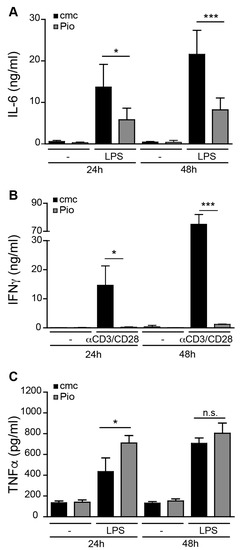 In murine models of immune-mediated hepatitis, immune cells involved in the induction of liver damage include LSEC, CD4 T cells and Kupffer cells [13,14,15]. Thus, we investigated the effect of in vivo PPARγ activation on these immune cell populations. Mice were fed with the PPARγ ligand Pioglitazone (Pio) or the vehicle carboxy-methyl-cellulose (cmc) alone for 7 days, after which LSEC or Kupffer cells were isolated from the liver, or T lymphocytes from the spleen. As LSEC express TLR4 [16], we stimulated LSEC isolated from Pio- and vehicle-fed mice with the TLR4 ligand LPS and analyzed their production of the pro-inflammatory cytokine IL-6. LPS induced substantial IL-6 production by LSEC, which was significantly reduced when PPARγ was activated (Figure 1A). Similarly, PPARγ activation in vivo inhibited the function of splenic T cells as their ability to produce IFNγ (Figure 1B) ex vivo upon anti-CD3ε/CD28 stimulation was severely reduced over time (Figure 1B). Although the anti-inflammatory effects of PPARγ in macrophages have been well documented [2], in vivo PPARγ activation did not inhibit TNFα production by Kupffer cells ex vivo after LPS stimulation (Figure 1C), but increased early (24 h) but not late (48 h) TNFα production. Taken together, our data suggest that in vivo PPARγ ligation has potent anti-inflammatory effects on T cells and LSEC, but not on TNFα production by Kupffer cells.