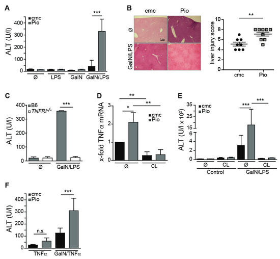 Oral administration of Pioglitazone sensitizes mice for immune-mediated experimental hepatitis. (A,B,D,E,F) C57BL/6 and (C) TNF receptor I (TNFRI)−/− mice were fed with 30 mg/kg Pioglitazone or with vehicle (cmc) for 7 days. (A) Plasma ALT levels from C57BL/6 mice after 6–7 h after the i.p. injection of GalN, LPS, GalN/LPS or phospate buffered saline (PBS). (B) Exemplary H&E staining of livers of as-indicated at 20× magnification. The bar graph depicts a histological liver injury score as detailed in the Materials and Method Section of vehicle (n = 7) and vehicle + Pioglitazone (n = 9)-treated mice. (C) Plasma ALT levels 6–7 h after i.p. GalN/LPS or PBS injection into C57BL/6 and TNFRI−/− mice that were fed with Pio for 7 days. (D) C57BL/6 mice that were fed with Pio or vehicle (cmc) for 7 days were injected with clodronate liposomes (CL) or were left untreated. Then, mice received GalN/LPS i.p. and 1 h later, intrahepatic TNFα mRNA levels were determined by real-time polymerase chain reaction (PCR). (E) Plasma ALT levels were determined 6–7 h after injection of GalN/LPS in clodronate liposome (CL)-injected and non-injected C57BL/6 mice. (F) Pio- and vehicle-fed C57BL/6 mice were injected with 400 ng TNFα 30 min post GalN injection or received GalN alone. Plasma ALT levels were measured 4 h later. Error bars indicate mean ± SD, n ≥ 4; one representative experiment (A, C–F) out of three is shown. * p ≤ 0.05, ** p ≤ 0.01, *** p ≤ 0.001, n.s. = not significant.