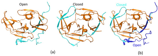 Figure 2. Open and closed conformations of the proteases. (a) Open and closed conformations of WNV protease. The non-structural protein 2B (NS2B) and NS3pro are shown in cyan and orange, respectively. (b) Structural comparison of open and closed proteases. The structures of open (PDB identifier (ID) 2FOM) and closed (PDB ID 2FP7) proteases are shown. The NS2B C-terminal portion from the cofactor is away from the active site to form an open conformation. NS2B in the open and closed conformations is shown in blue and cyan, respectively. To make it clear, only NS3 from the closed conformation is shown.