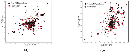 Figure 3. 1H–15N-heteronuclear single quantum coherence (HSQC) spectra of Dengue virus (DENV) (a) and WNV protease (b) in the absence and presence of an inhibitor. The spectra of free and ligand-bound proteases are shown in black and red, respectively. More cross-peaks were observed when the protease formed a complex with an inhibitor. The spectra were obtained from Reference [58] with slight modifications. Similar results were also obtained in other studies [52,53].