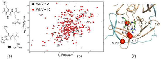 Figure 5. Using NMR spectroscopy to understand the structure-activity relationship (SAR) of peptidic inhibitors. (a) Structures of inhibitors used for comparison. (b) 1H–15N-HSQC spectra of WNV protease bound to compound 2 (black) and 10 (red). The residues which exhibited chemical shift difference are labeled with residue name and sequence number. (c) A model of WNV protease in complex with compound 2. The residues which exhibited chemical shift changes more than 0.1 ppm are shown as red spheres and labeled with residue name and sequence number. The figures were obtained from Reference [54] with permission.