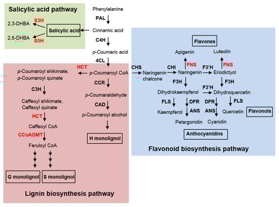 The phenylpropanoid pathway, modified according to previous studies [,]. 4CL, 4-hydroxycinnamoyl-CoA ligase; ANS, anthocyanidin synthase; C3H, p-coumarate 3-hydroxylase; C4H, cinnamate 4-hydroxylase; CAD, cinnamyl-alcohol dehydrogenase; CCoAOMT, caffeoyl-CoA O-methyltransferase; CCR, cinnamoyl-CoA reductase; CHI, halcone isomerase; CHS, chalcone synthase; COMT, caffeic/5-hydroxyferulic acid O-methyltransferase; DFR, dihydroflavonols reductase; F3′H, flavonol 3′-hydroxylase; F3H, flavanone 3-hydroxylase; F5H, ferulate 5-hydroxylase; FLS, flavonol synthase; FNSI, flavone synthase Ι; HCT, hydroxycinnamoyltransferase; PAL, phenylalanine ammonia lyase; S3H, SA 3-hydroxylase; S5H, SA 5-hydroxylase.