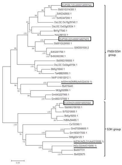 The Arabidopsis genome contains one AtDMR6/AtS5H/AtFNSI and two DMR6-like oxygenases, AtDLO1 (AtS3H) and AtDLO2. Using AtDMR6 and AtS3H as queries to blast the maize genome database (MaizeGDB), we identified two ZmFNSI homologs, ZmFNSI-1 (Zm00001d029744) and ZmFNSI-2 (Zm00001d027423), and one ZmS3H homolog (Zm00001d002564) in maize (Table 1). Phylogenetic analysis showed that FNSIs and S3Hs from different plant species are divided into two groups, and each group was further separated into two clades containing FNSIs or S3Hs from dicots and monocots (Figure 2).