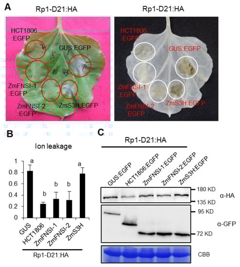 To investigate the function of ZmFNSIs and ZmS3H in Rp1-D21-mediated HR, we employed the agrobacteria-mediated transient expression system in N. benthamiana. Rp1-D21 was fused with a 3× hemagglutinin tag at the C-terminus (Rp1-D21:HA), while ZmFNSI-1, ZmFNSI-2 and ZmS3H were fused with enhanced green fluorescent protein (EGFP) at the C-terminus (ZmS5H:EGFP and ZmS3H:EGFP). GUS:EGFP and HCT1806:EGFP were used as controls. Consistent with our previous studies [,,], when GUS:EGFP was transiently co-expressed with Rp1-D21:HA in N. benthamiana, an obvious HR phenotype was observed at three days post-infiltration (dpi). No HR was observed in leaf sectors in which HCT1806:EGFP and Rp1-D21:HA were co-expressed (Figure 3A). When ZmFNSI-1, ZmFNSI-2 and ZmS3H were separately transiently co-expressed with Rp1-D21:HA in N. benthamiana, ZmFNSI-1 and ZmFNSI-2, but not ZmS3H, suppressed Rp1-D21-mediated HR (Figure 3A). Consistent with our visual observations, ZmFNSI-1, ZmFNSI-2 and HCT1806 significantly reduced ion leakage levels compared to GUS or ZmS3H when co-expressed with Rp1-D21:HA (Figure 3B). Western blot results showed that co-expression of ZmFNSI-1, ZmFNSI-2 and ZmS3H did not have obvious change of the Rp1-D21 expression, compared to co-expression of GUS:EGFP (Figure 3C).