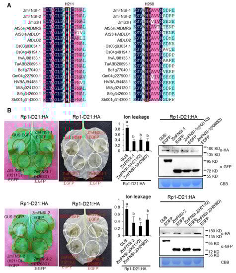 Mutation in the predicted catalytic active site of ZmFNSIs still suppressed Rp1-D21-mediated HR. (A) Multiple sequence alignments of FNSIs from different plant species were aligned by DNAMAN software. The conserved His (H) residues at position 211 and 268 of ZmFNSIs are boxed. (B) ZmFNSIs and their mutant derivatives were transiently co-expressed with Rp1-D21 into N. benthamiana. The representative leaf was photographed at 3 days after inoculation (left), and the same leaf was cleared by ethanol (middle). Ion leakage conductivity (average ± standard error (SE), n > 5) was measured at 61 h after co-expression of GUS and ZmFNSI-drivations with Rp1-D21. Significant differences (p < 0.05) between samples are indicated by different letters (a–b). Total protein was extracted from agro-infiltrated leaves at 48 hpi. Anti-HA was used to detect the expression of Rp1-D21, and anti-GFP was used to detect the expression of GUS, ZmFNSIs and their mutant derivatives. Equal loading of protein samples was shown by CBB staining of Rubisco.