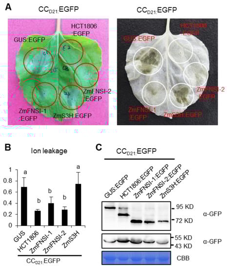Investigating the function of ZmFNSIs and ZmS3H in CCD21 induced HR. (A) ZmFNSIs and ZmS3H were transiently co-expressed with CCD21 into N. benthamiana. The representative leaf was photographed at 3 days after inoculation (left), and the same leaf was cleared by ethanol (right). (B) Ion leakage conductivity (average ± SE, n > 5) was measured at 61 h after co-expression of GUS, HCT, ZmFNSIs or ZmS3H with CCD21. Significant differences (p < 0.05) between samples are indicated by different letters (a–b). (C) Total protein was extracted from agro-infiltrated leaves at 30 hpi. Anti-GFP was used to detect the expression of GUS, HCT, ZmFNSIs and ZmS3H. Equal loading of protein samples was shown by CBB staining of Rubisco.