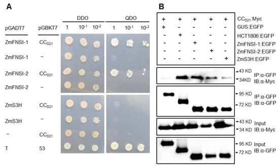 Investigating the interactions between CCD21 and ZmFNSIs or ZmS3H. (A) Investigating the interactions between CCD21 and ZmFNSIs or ZmS3H by yeast two hybridization (Y2H) assay. CCD21 was constructed into pGBKT7 and ZmFNSIs and ZmS3H were constructed into pGADT7. SV40 large T-antigen (T) and murine p53 (53) were used as the positive controls. “−” indicated empty vector. DDO: SD-Leu-Trp; QDO: SD-Leu-Trp-Ade-His. (B) Investigating the interactions between CCD21 and ZmFNSIs or ZmS3H by co-immunoprecipitation (Co-IP) assay. EGFP- and 4×c-Myc-tagged constructs were transiently co-expressed in N. benthamiana and samples were collected at 30 hpi for the Co-IP assay. Protein extracts were immunoprecipitated (IP) by anti-GFP (α-GFP) microbeads and detected (immunblotted; IB) by anti-GFP and anti-Myc (α-Myc) antibodies.